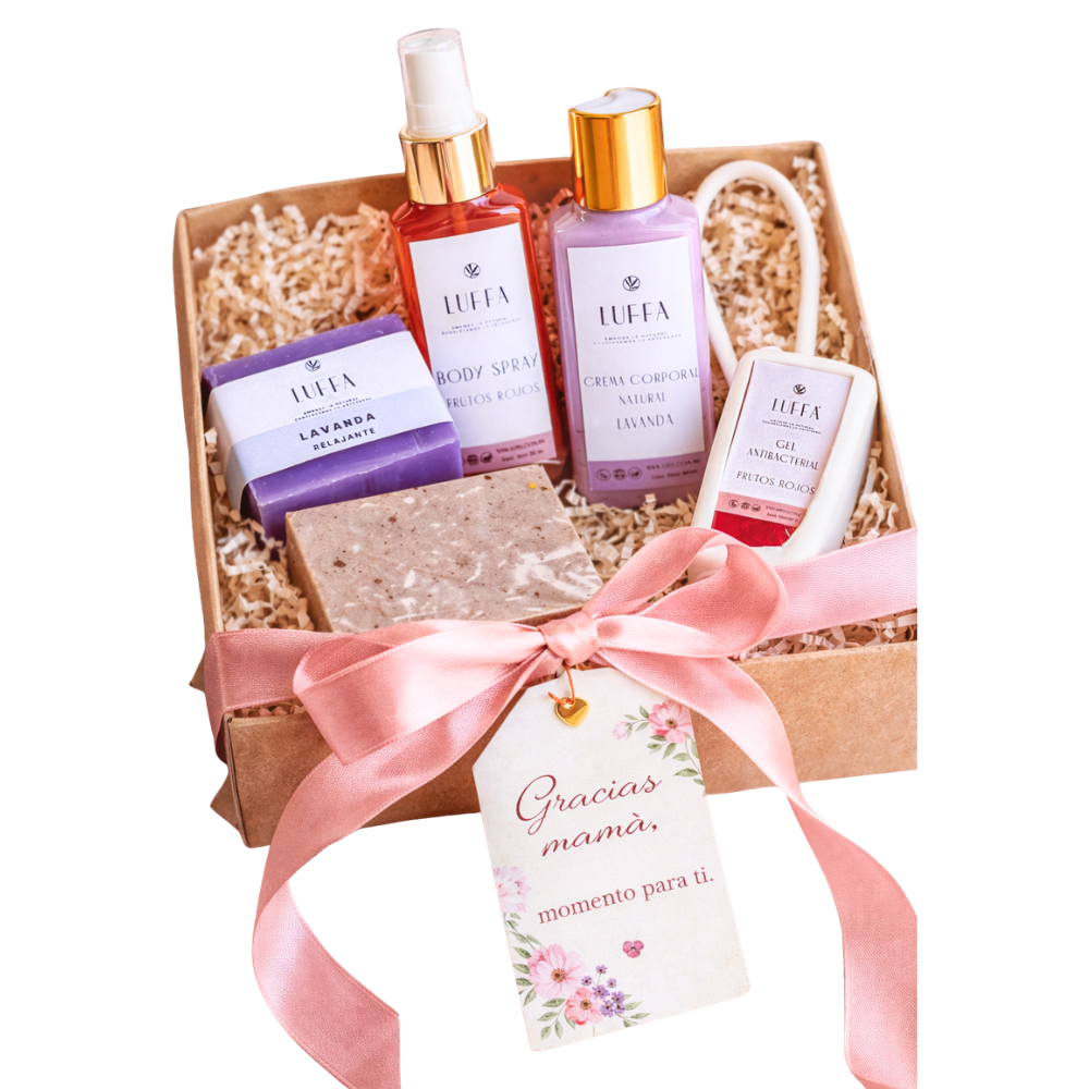 Caja de MDF personalizada a tu gusto: 2 jabones artesanales de 100g, 1 crema para manos, 1 body spray y 1 gel antibacterial de bolsillo